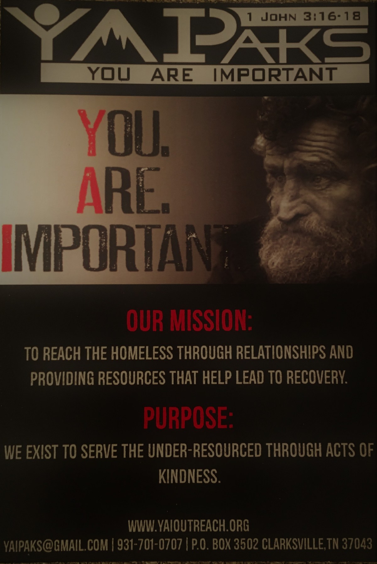 Sherry shared how YAIPaks was born.  She became overcome with compassion for a woman she saw on the street. The woman was sitting on a bench trying to comb through her matted hair.  Sherry also noticed a small stuffed animal in the woman’s basket of possessions.  She knew it must be of great importance to her.  Sherry told the story of how she and her children had been homeless for one week while escaping domestic violence. Sherry had also carried with her a small stuffed animal which was the only thing that she had that connected her with her birth mother.   Sherry said she went home that night, retreated to her prayer closet and prayed all night.  The Holy Spirit led her to pack her abundance of handbags with anything that would have been beneficial to her during the time she was homeless.  Thus, the Holy Spirit birthed YAIPaks.