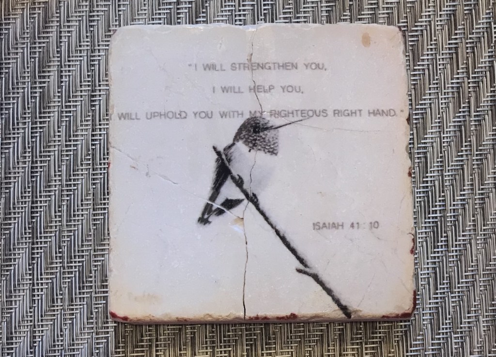 Pictured above is a coaster from artist, David Arms with Is. 41:10 printed on it.  I thought it was the sweetest little art piece until I dropped in on the floor and broke it to pieces.  I thought it was destroyed.  However,  I loved it so that I picked up the fragments and glued it back together.  This is what God does with our lives.  The little square will never be the same, but it is saved and beautiful in its brokenness.