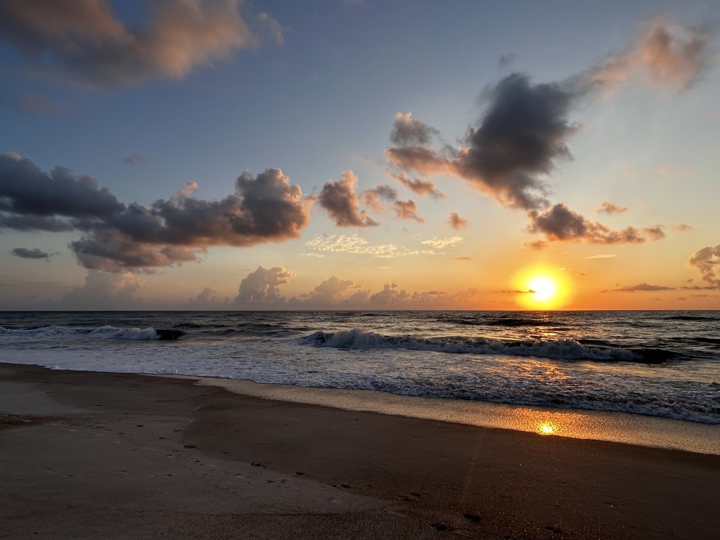 It was our last day at the beach. The weather aps predicted an overcast day. I was so tired; I thought about skipping sunrise and sleeping in. However, anyone who knows me, knows one of my greatest joys is chasing the sunrise. I arose and walked to the end of the boardwalk about 6:15 AM. I took a seat on a bench and awaited the show. A smile crossed my face when a young couple passed by dressed to take pictures at the dawn.